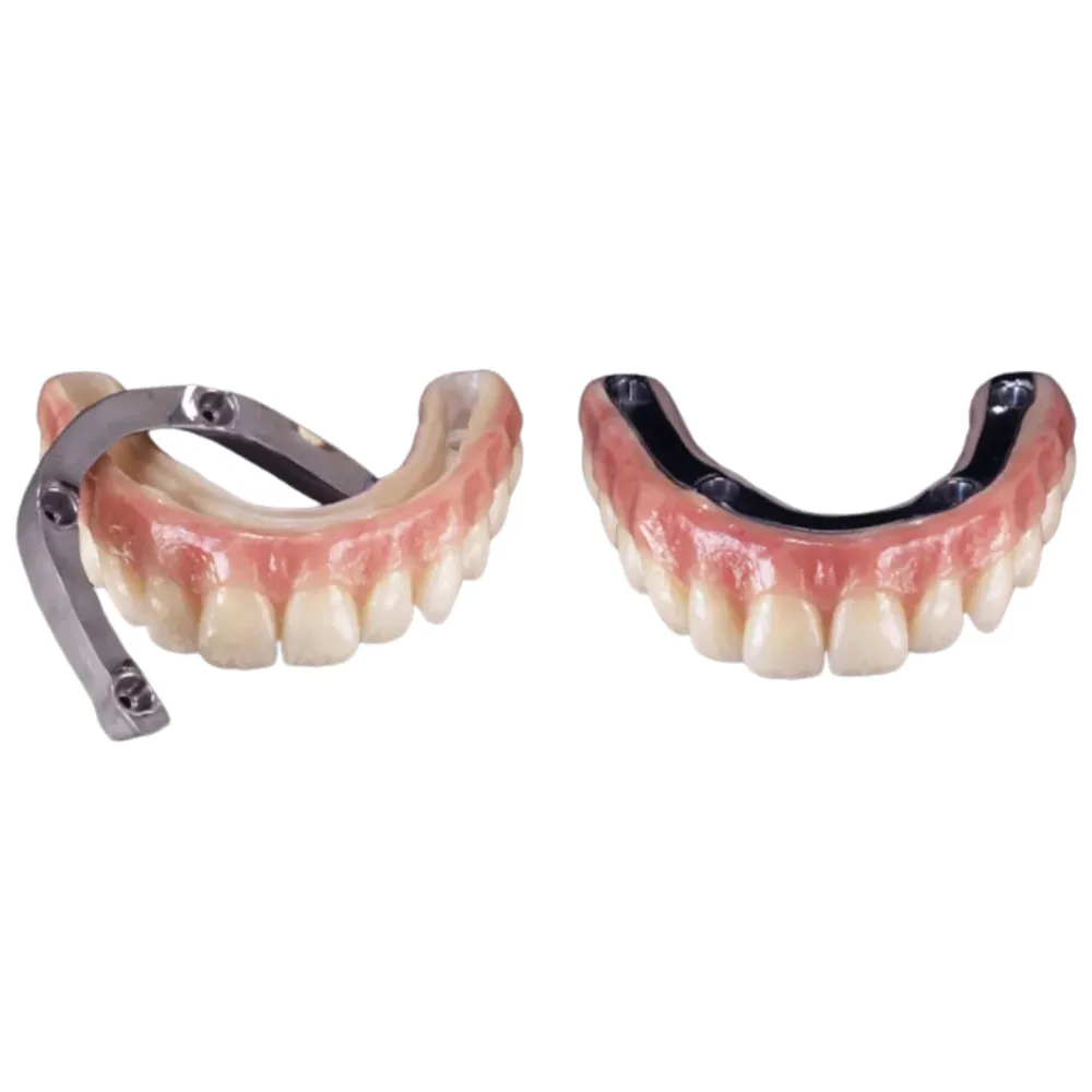 The restoration is made from a space-age, graphene-infused polymer engineered for strength and flexibility. Unlike brittle zirconia, this material is layered over a titanium bar, giving you the strength to chew comfortably and a smooth, quiet bite with no clacking or stiffness.
